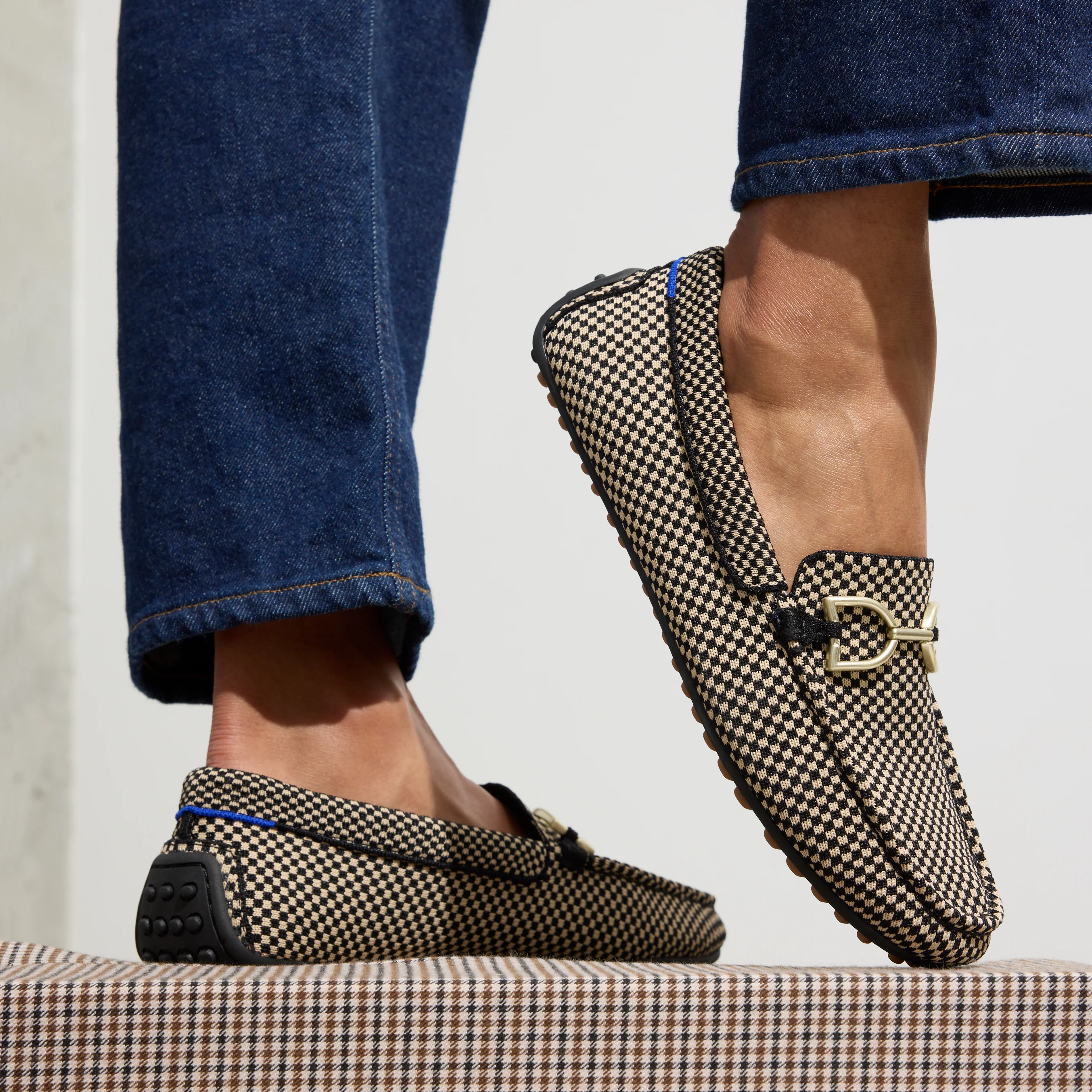 - Soft, flexible upper in an ivory and black micro checkered pattern with a gold hardware signet bit on the vamp.